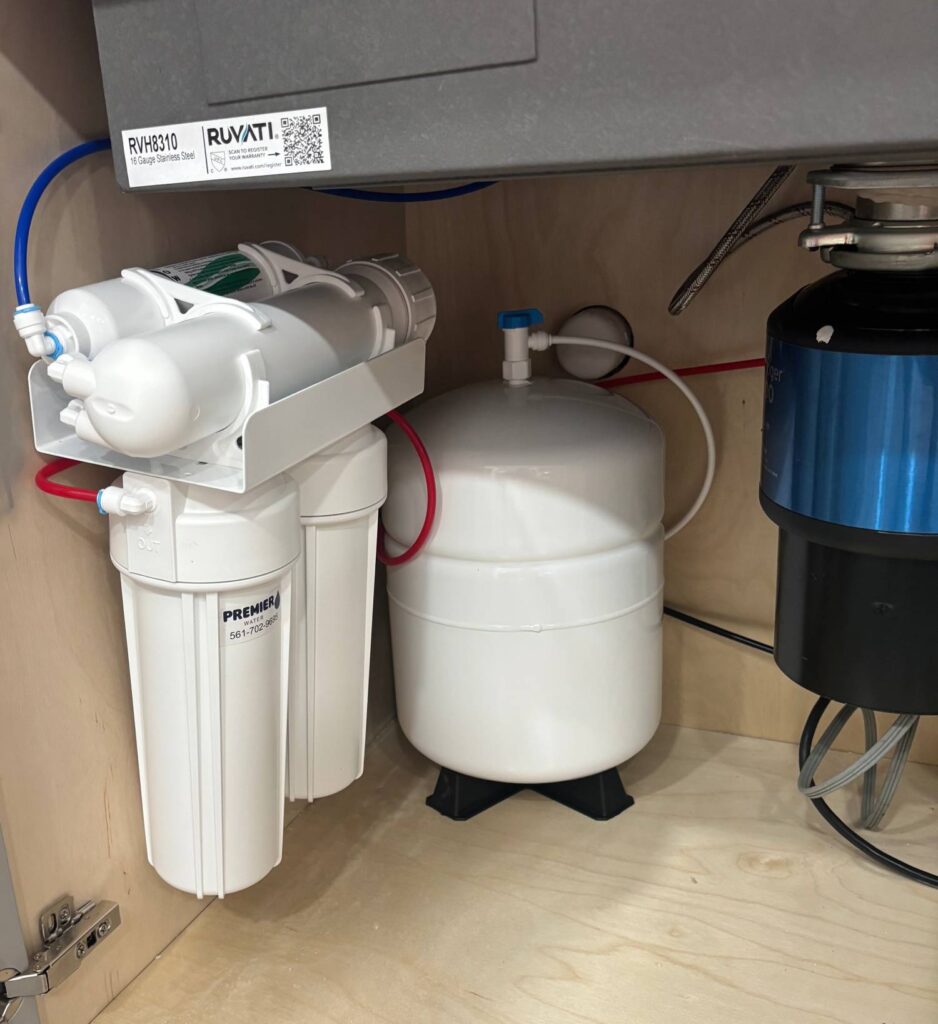 Whole-home filters, softeners, iron & sulfur filters, and UV units are installed at the main water line to treat all incoming water. Reverse Osmosis (RO) systems are usually installed under the kitchen sink for drinking water.